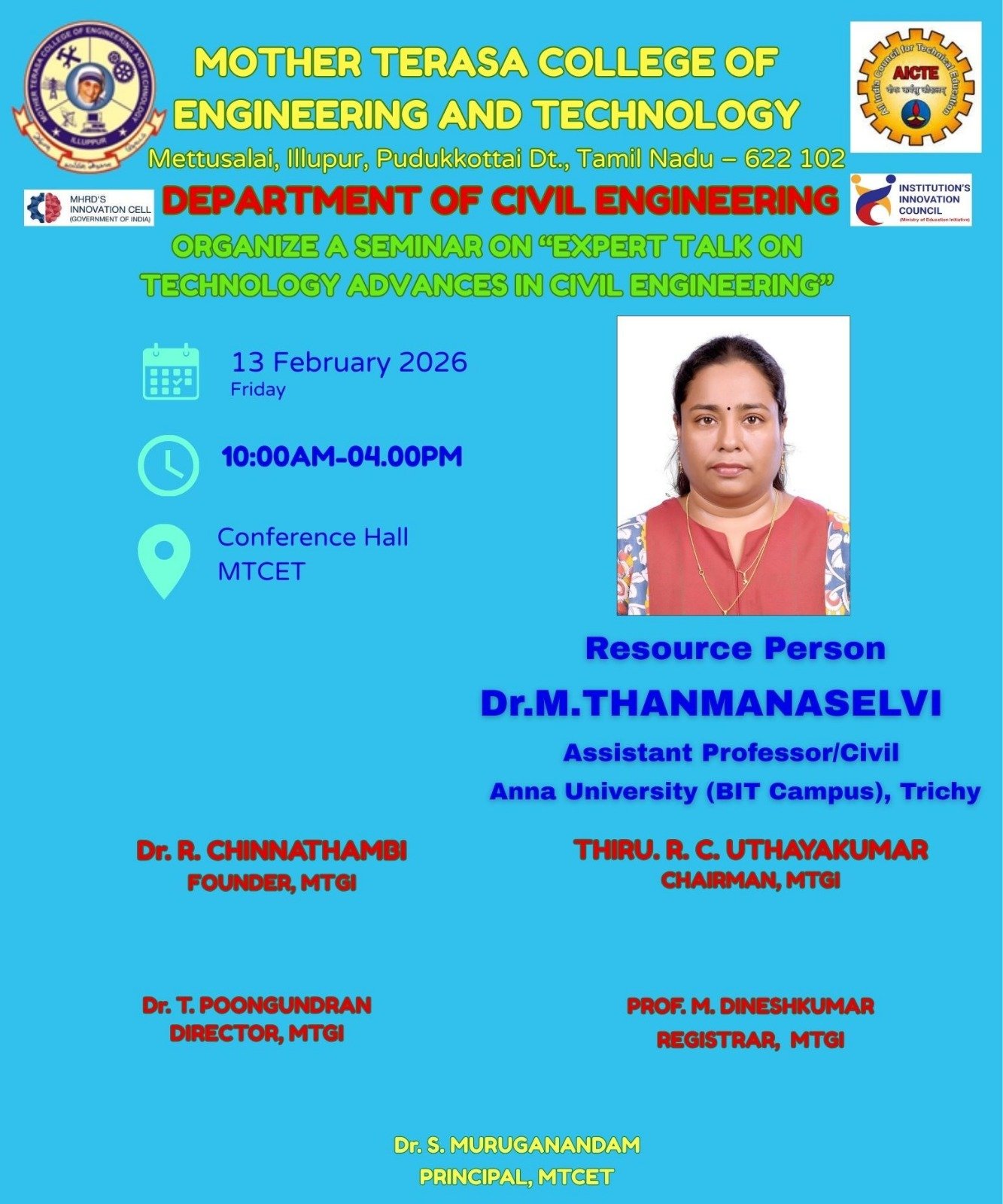 Convenor: Dr. S. Muruganandam (Principal, MTCET)