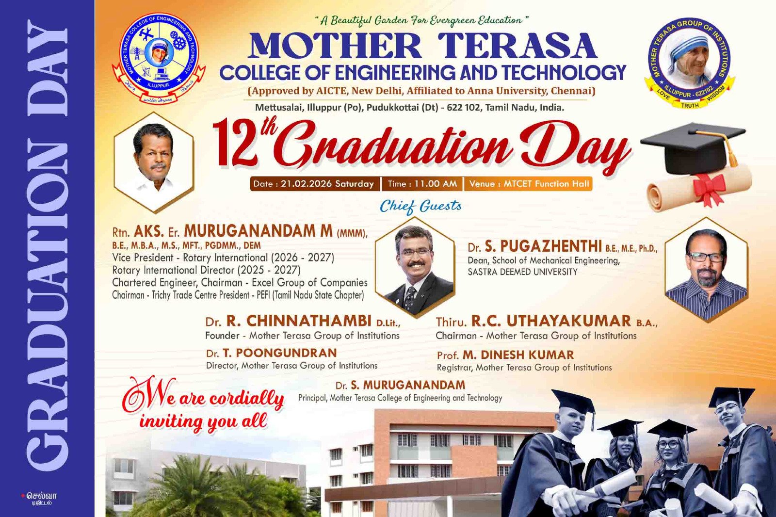 Mother Terasa College of Engineering and Technology, Iluppur, will host its 12th Graduation Day on 21 February 2026. The upcoming event will celebrate the achievements of graduating students in the presence of distinguished guests.