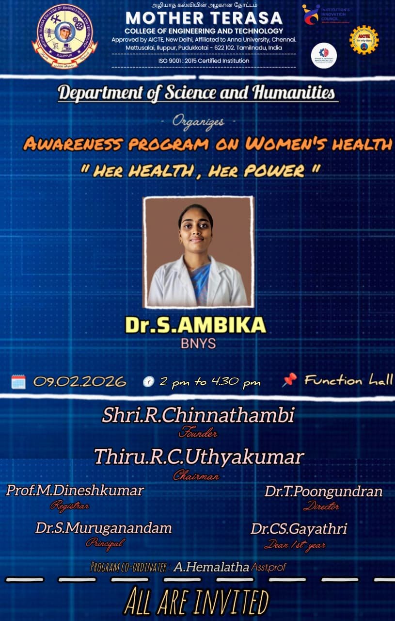 The Department of Research and Development, Mother Teresa College of Engineering and Technology, Illupur, Pudukkottai (Approved by AICTE, New Delhi and Affiliated to Anna University, Chennai) proudly organizes the International Conference – AISEC 2026 on “Advances and Innovations in General Science, Engineering and Computing” scheduled for 23rd January 2026.