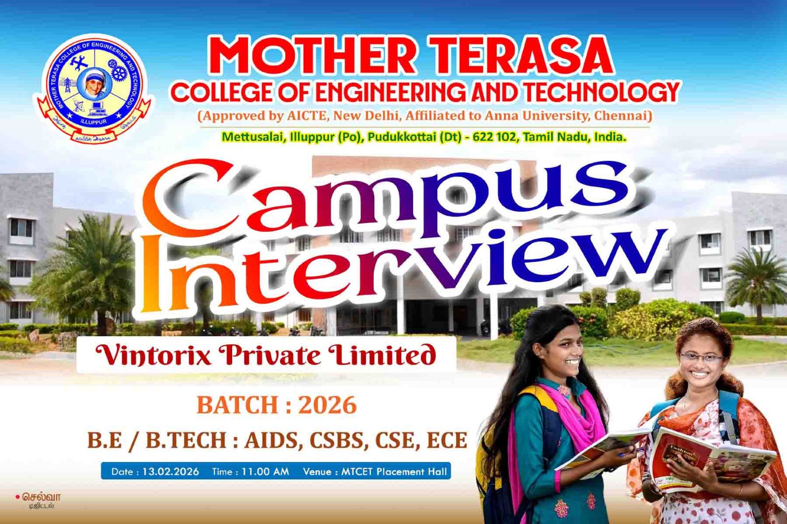 Mother Teresa College of Engineering and Technology conducted a campus interview drive with Vintorix Private Limited on 13 February 2026 at the Placement Hall. Students from B.E / B.Tech programs including AIDS, CSBS, CSE, and ECE participated actively in the recruitment process.
